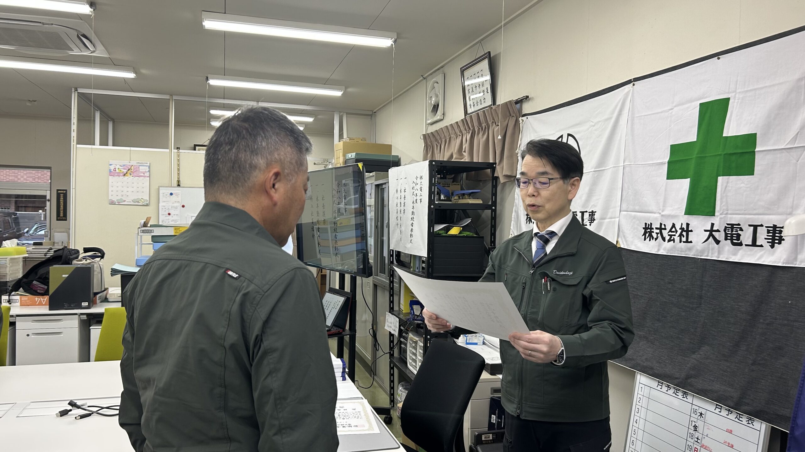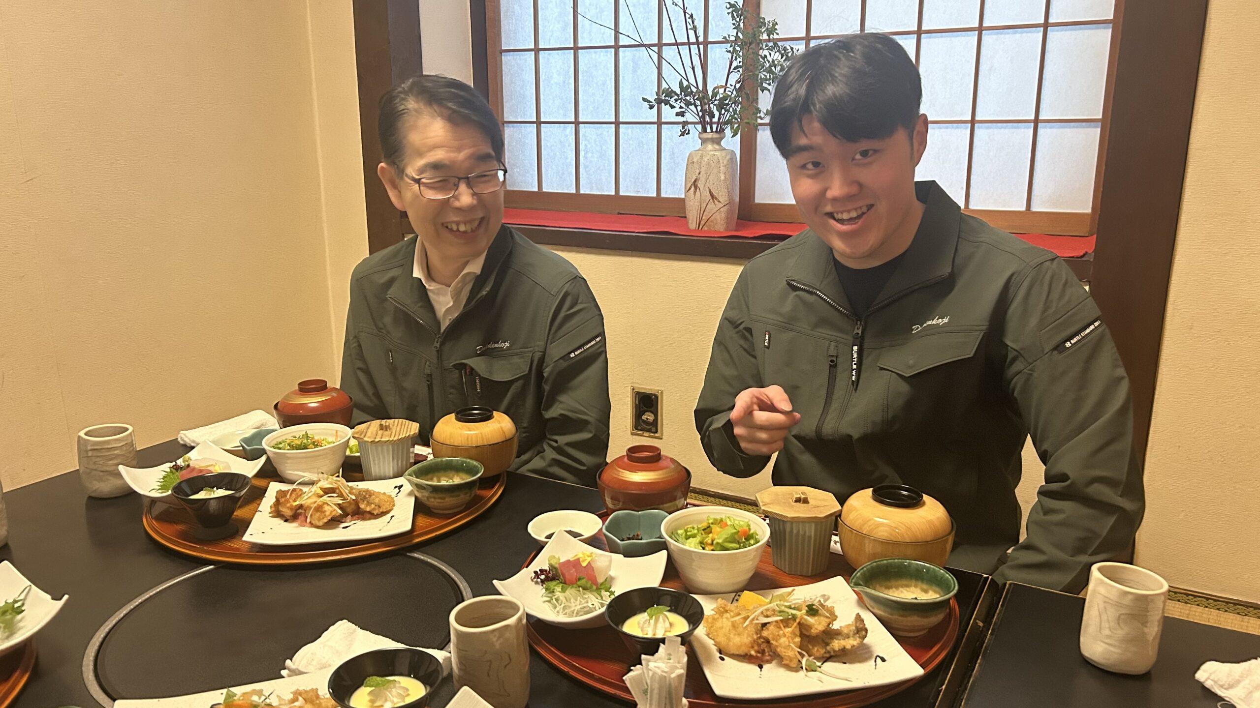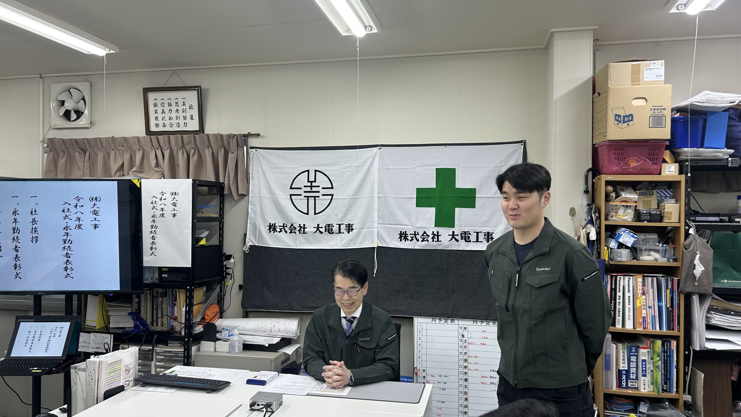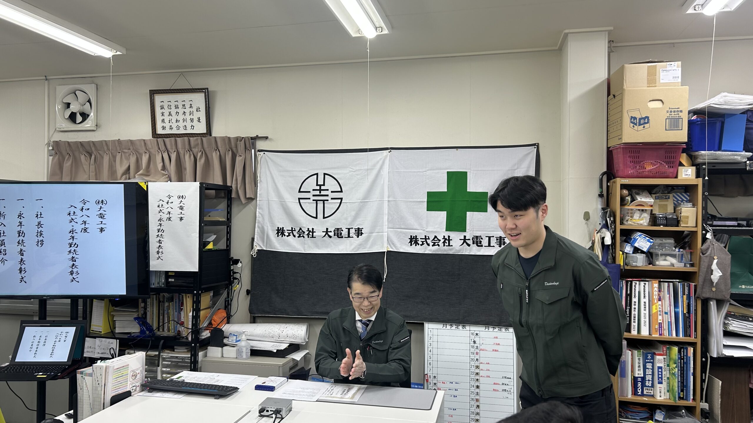まずはじめに社長からの挨拶。 ワンツーマンなので新入生の河本くんも少し緊張気味のようです。。